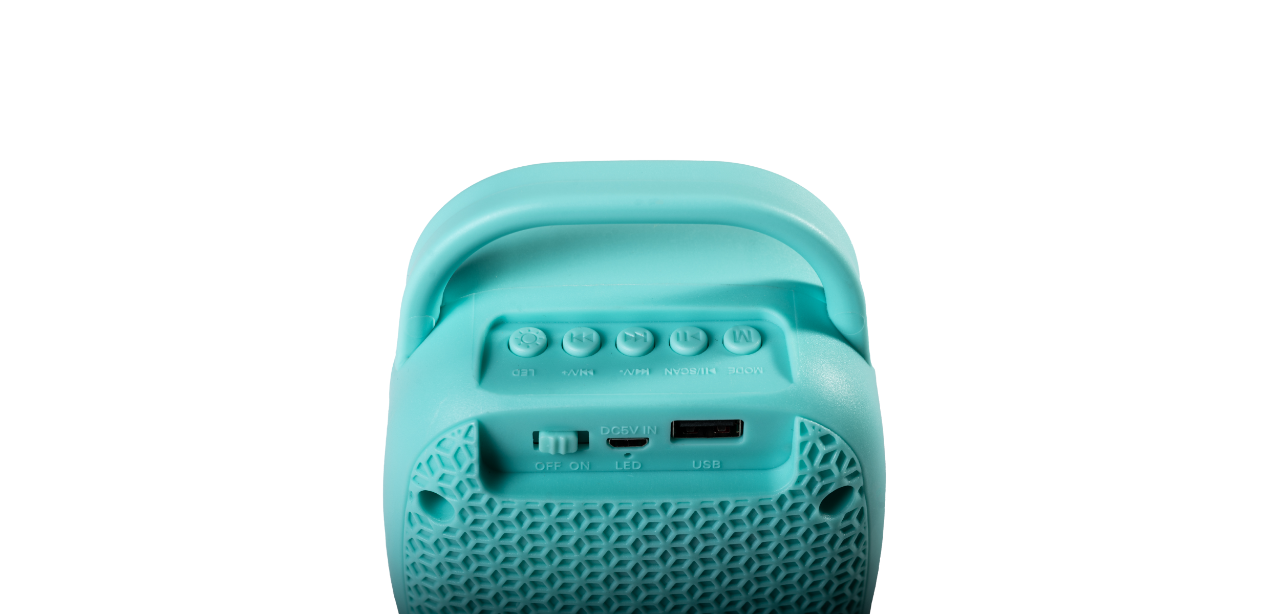 Хуманизираните бутони Ви позволяват лесно да контролирате силата на звука, да пропускате песни, да сменяте радиостанции, да превключвате от радио на bluetooth или usb флашка, да сменяте режима на светлината и да включвате/изключвате тонколоната.